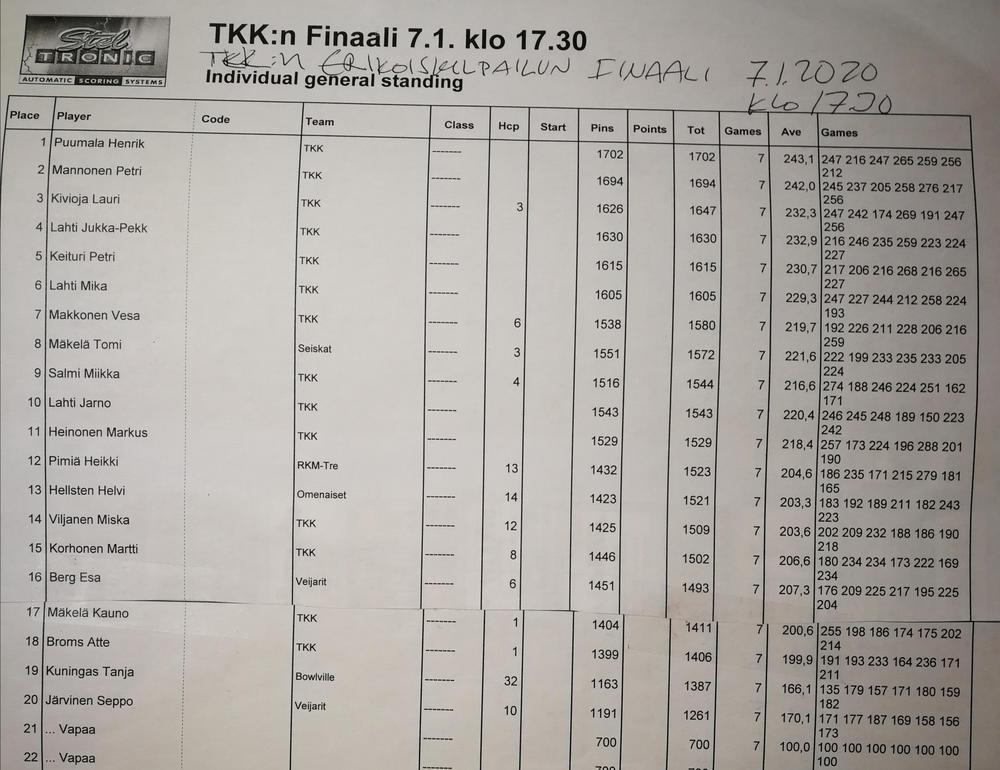 TKK:nErikoiskilpailun tulostaso nousi odotetun korkealle. Aloitus oli hurjaa, kun useampi keilaaja pommitti 250 pintaan, Salmen Miikkan 274 johdolla. Miikka hallitsi alkua hienokseltaan 4 sarjaa, mutta sitten tuli noutaja. Puumala ja Mannonen nousivat tasaisesti kohti kärkeä Kiviojan Laurin säestäessä. Lopulta viimesen sarjan 10-ruuttun vaadittiin Henkalta tuplaa jotta ohittaisi Mannosen ja tulihan ne sieltä. Lauri ousi viimeisellä sarjalla kolmanneksi ohittaen Lahden Jukka-Pekan.