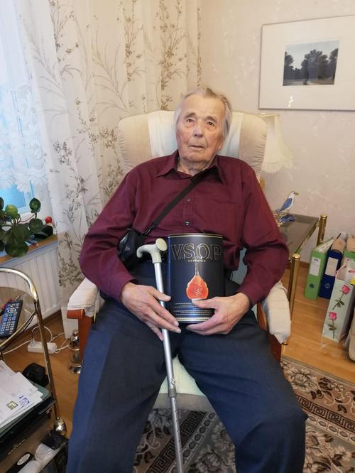 Matti Peltonen 90 v, Jyrki kävi tervehtimässä Mattia seuran lahjalla