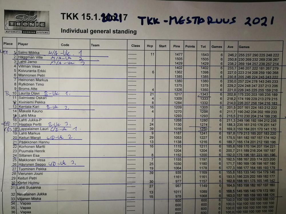 Perjantai-iltana 15.1.2021 keilattiin TKK:n mestaruudesta, kisaan oli ilmoittautunut 33 tkklaista.