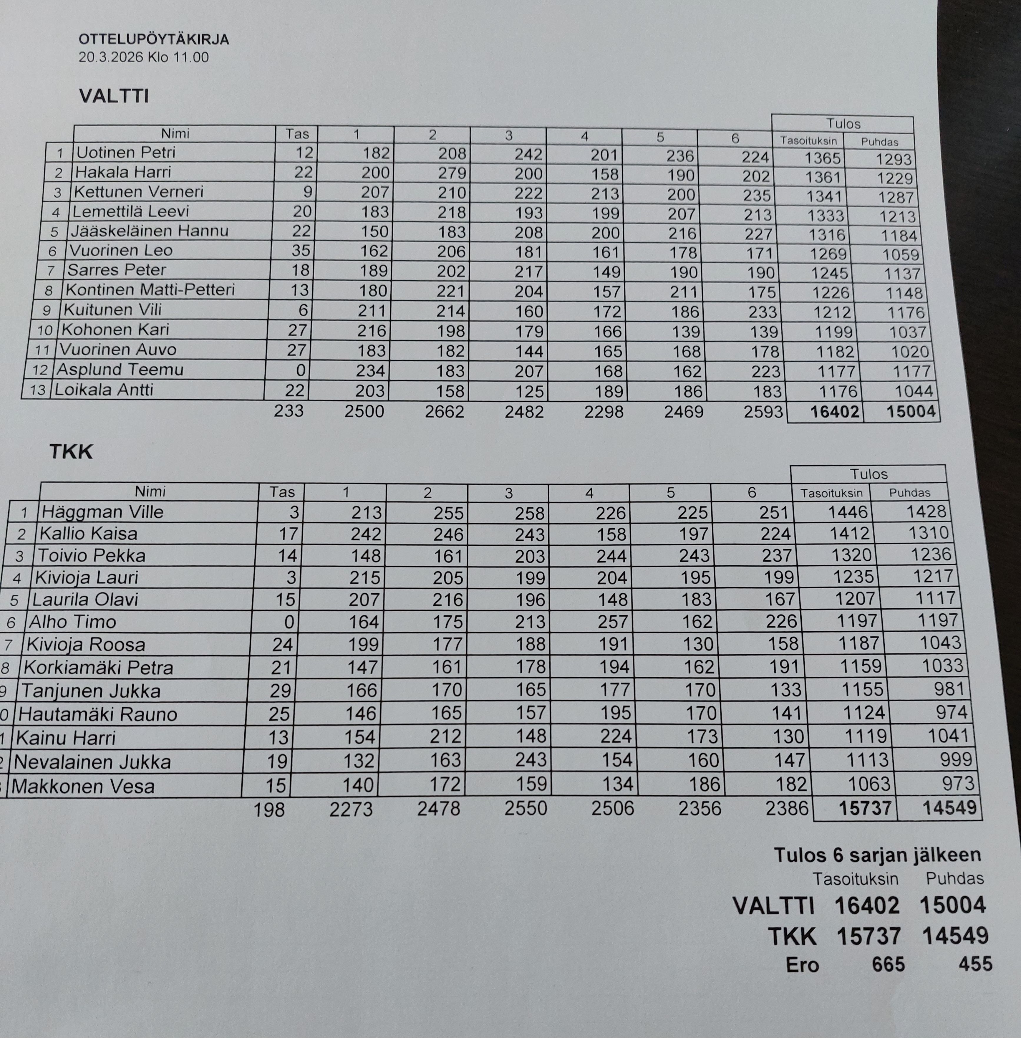 TKK:laiset kävivät ottelemassa Lahdessa Valttia vastaan 21.3.2026. Tällä kertaa pelattiin 13 pelaajalla. Jälleen kerran jouduimme toteamaan Valtin paremmaksi. Henkilökohtaisista tuloksista paras oli kuitenkin meidän Ville Häggman 1428 puhtaalla.